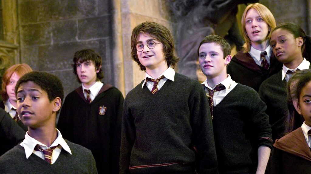 Kuvassa nähdään Devon Murray, joka näytteli velhomaailmassa Seamus Finnigania, Colin Creeveyn esittäjä Hugh Mitchell, Tolga Safer, joka näytteli velhokoulu Durmstrangin jäsentä sekä Oliver Woodin näyttelijä Sean Biggerstaff.