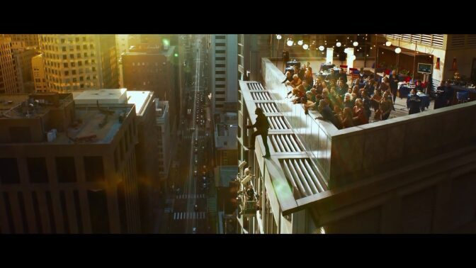 Kyseinen stuntti tehtiin viime vuonna San Franciscossa. Siinä Reeves ja Carrie-Anne Moss hyppäsivät talon katolta jääden roikkumaan turvavaljaiden varaan.