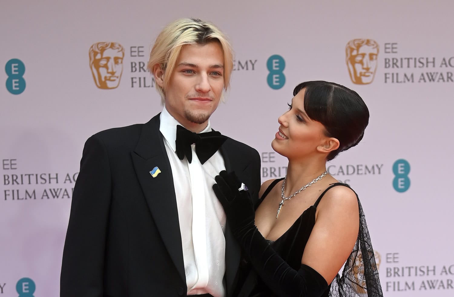 Stranger Things -tähti Millie Bobby Brown, 18, poseerasi yhdessä poikaystävänsä Jake Bongiovin, 19, kanssa Bafta-gaalan punaisella matolla 13. maaliskuuta.