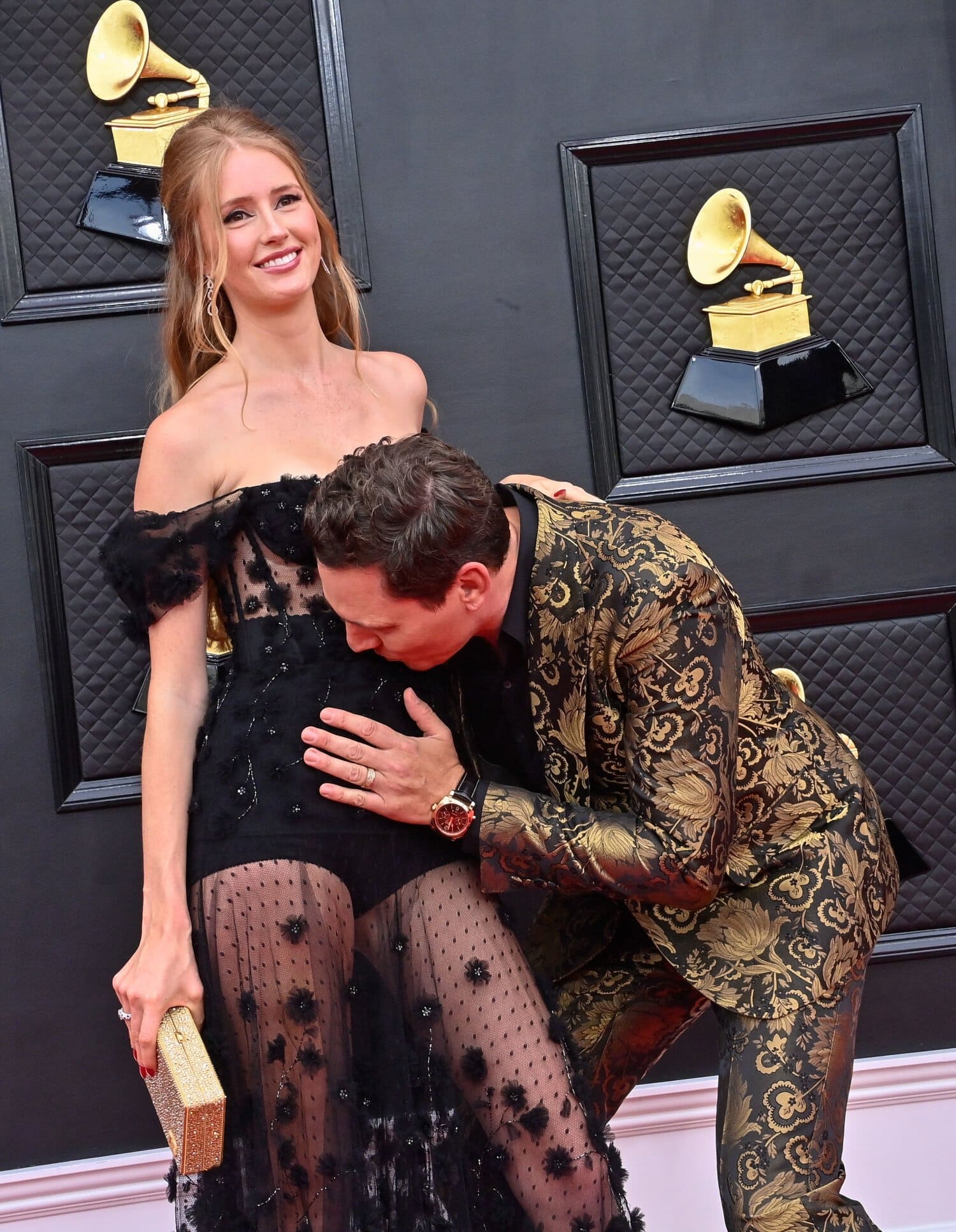 Poseeratessaan punaisella matolla Tiësto syleili vaimonsa vatsaa vetäen huomion vatsakumpuun.