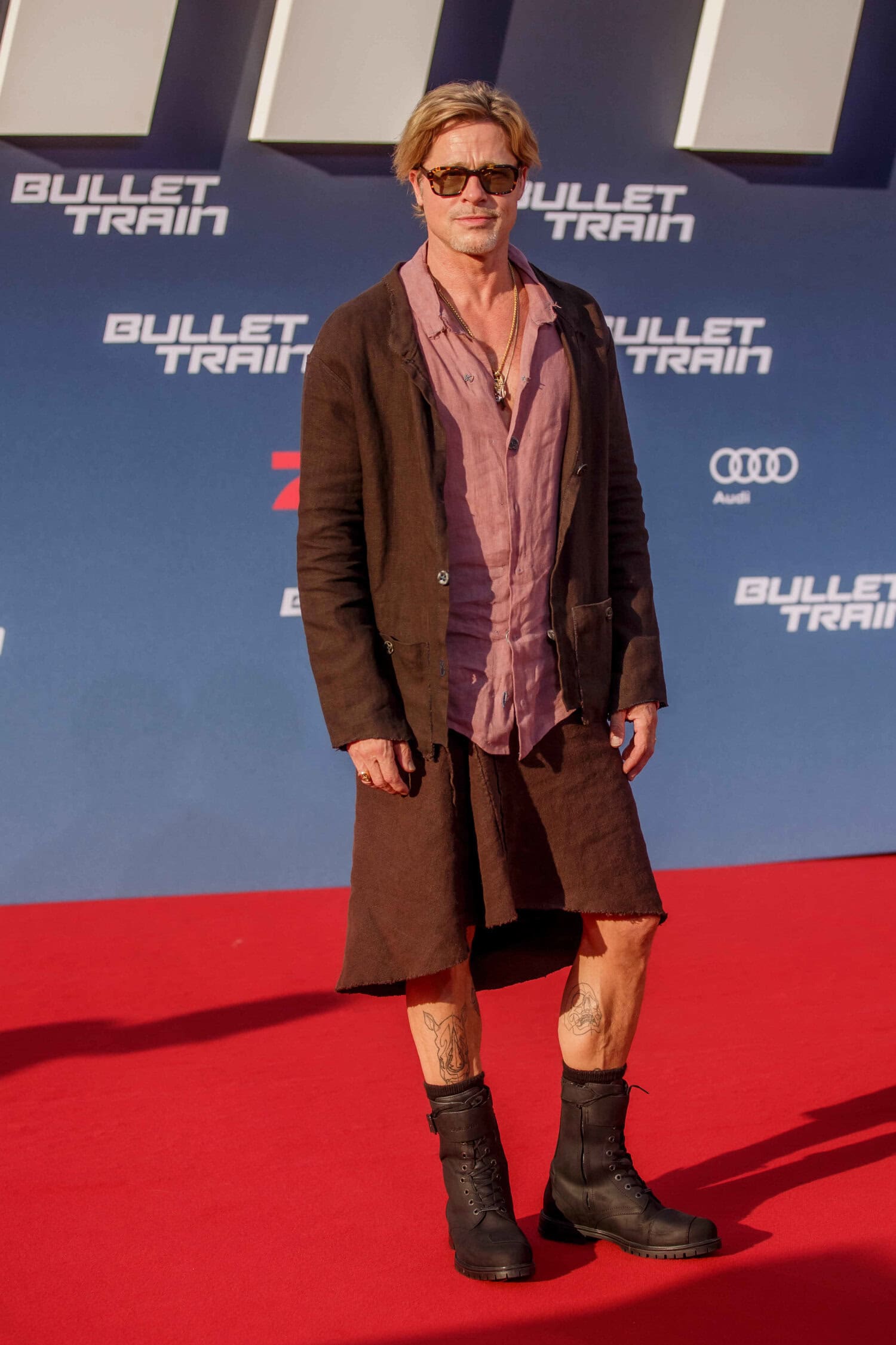Näyttelijä Brad Pitt, 58, yllätti ensi-iltalookillaan Berliinissä tiistaina. Mies markkinoi parhaillaan uutta Bullet Train -elokuvaansa, ja Berliinissä tähti säväytti hameessa.