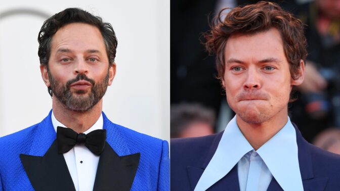 Laulaja-näyttelijä Harry Styles, 28, yllätti juhlakansan Venetsian filmifestivaaleilla muiskauttamalla Don’t Worry Darling -elokuvan näytöksessä suukon näyttelijäkollegansa Nick Krollin, 44, suulle.