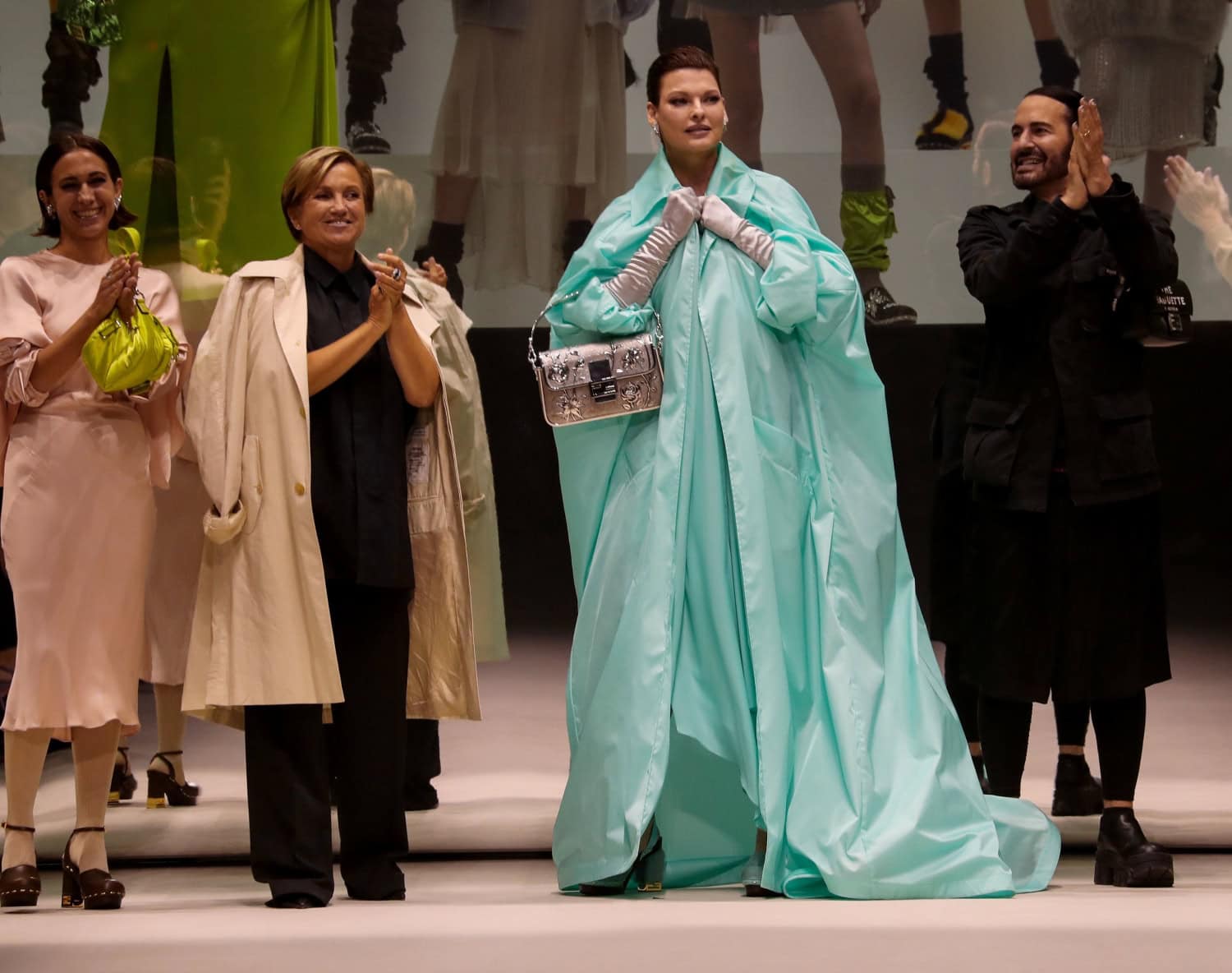Evangelista esiintyi Fendin legendaarisen Baguette-laukun 25-vuotispäivän kunniaksi järjestetyssä näytöksessä turkoosiin takkiin ja hopeisiin hanskoihin, hopeisen klassikkolaukun kanssa.