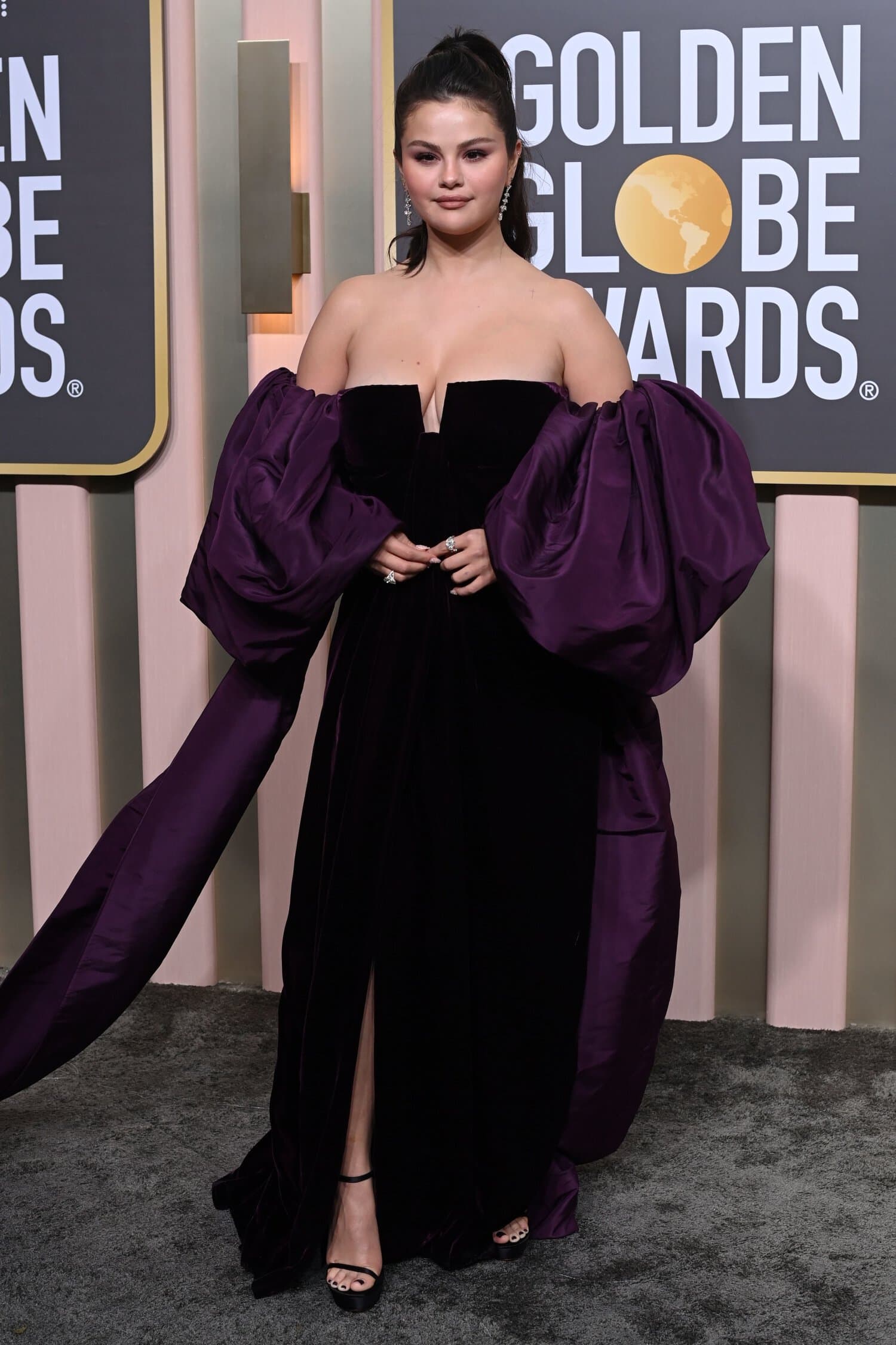 Laulaja osallistui Golden Globe -gaalaan tummassa, olkaimettomassa Valentinon iltapuvussa, jota koristivat violetit puffihihat. Gomez oli ehdolla parhaan naisnäyttelijän Golden Globe -palkinnonsaajaksi Mabel Moran -roolistaan Only Murders in the Buildin -ohjelmassa.