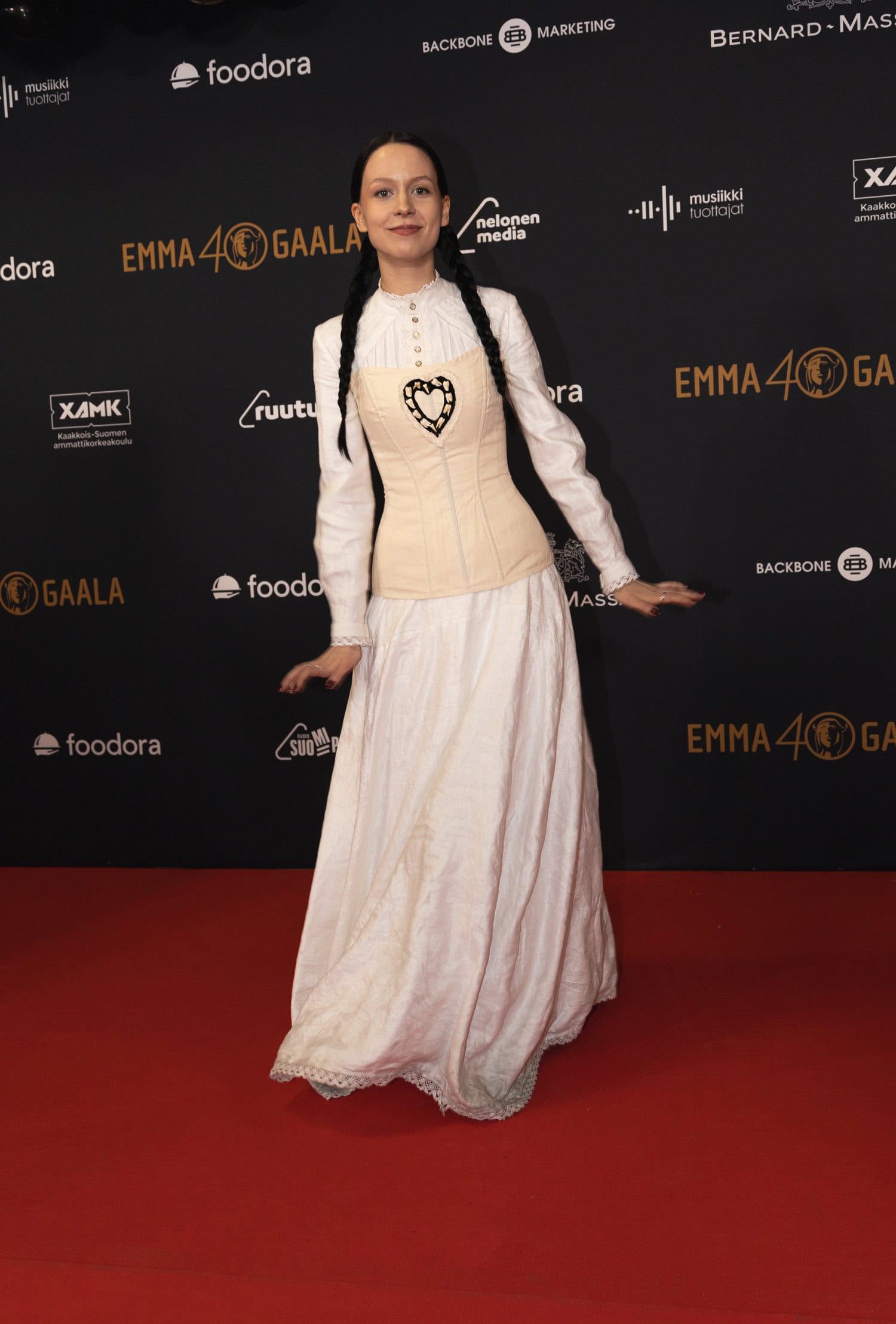 Yksi viime vuoden menestyksekkäimmistä tulokasartisteista Pehmoaino saapui perjantai-illan Emma Gaalaan persoonallisessa asussa. Pehmoaino, oikealta nimeltään Aino Morko, oli pukeutunut tyylilleen uskollisesti valkoiseen, vanhaa aikaa henkivään mekkokokonaisuuteen.