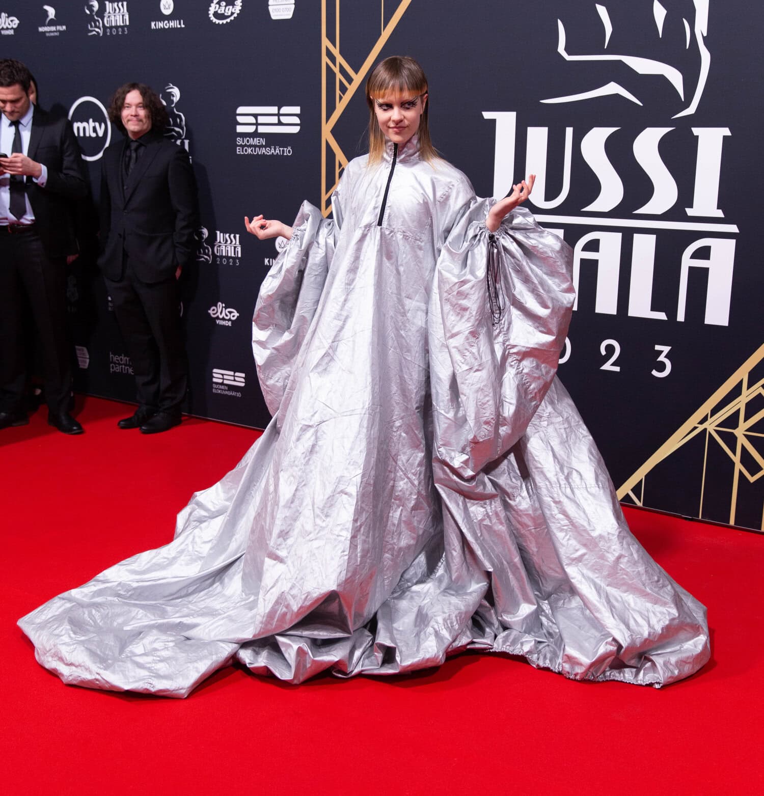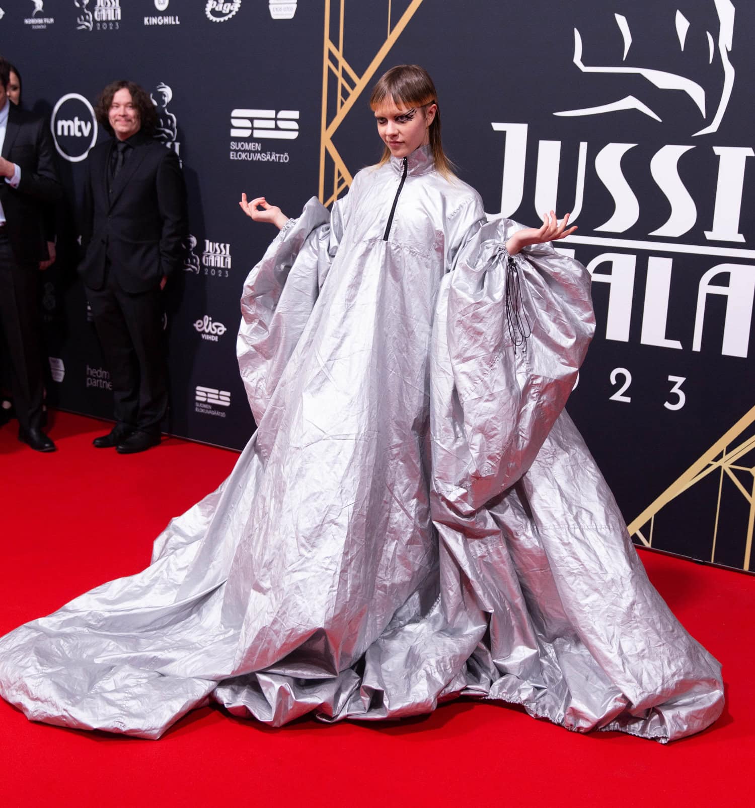 Näyttelijä Elsi Sloan, 22, saapui Jussi-gaalan punaiselle matolle huomiota herättävässä asussa. Näyttelijä oli pukeutunut suureen hopeiseen luomukseen, johon oli yhdistetty näyttävä musta silmämeikki. Sloanin asu oli todella väljä ja sen suuret pussimaiset hihat korostuivat näyttelijän poseeratessa kameroille.