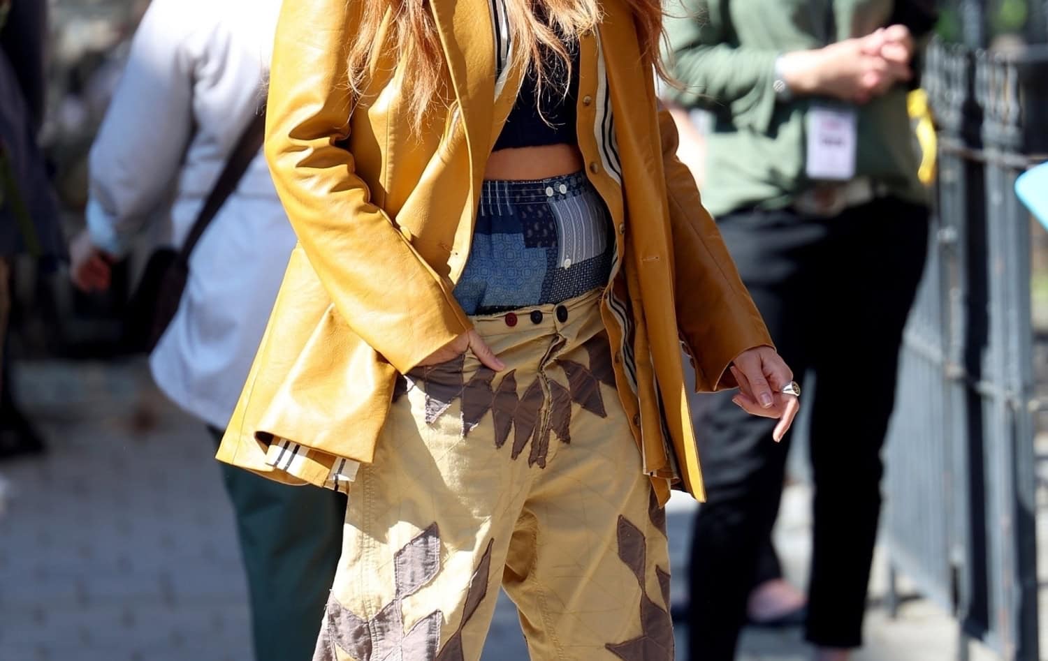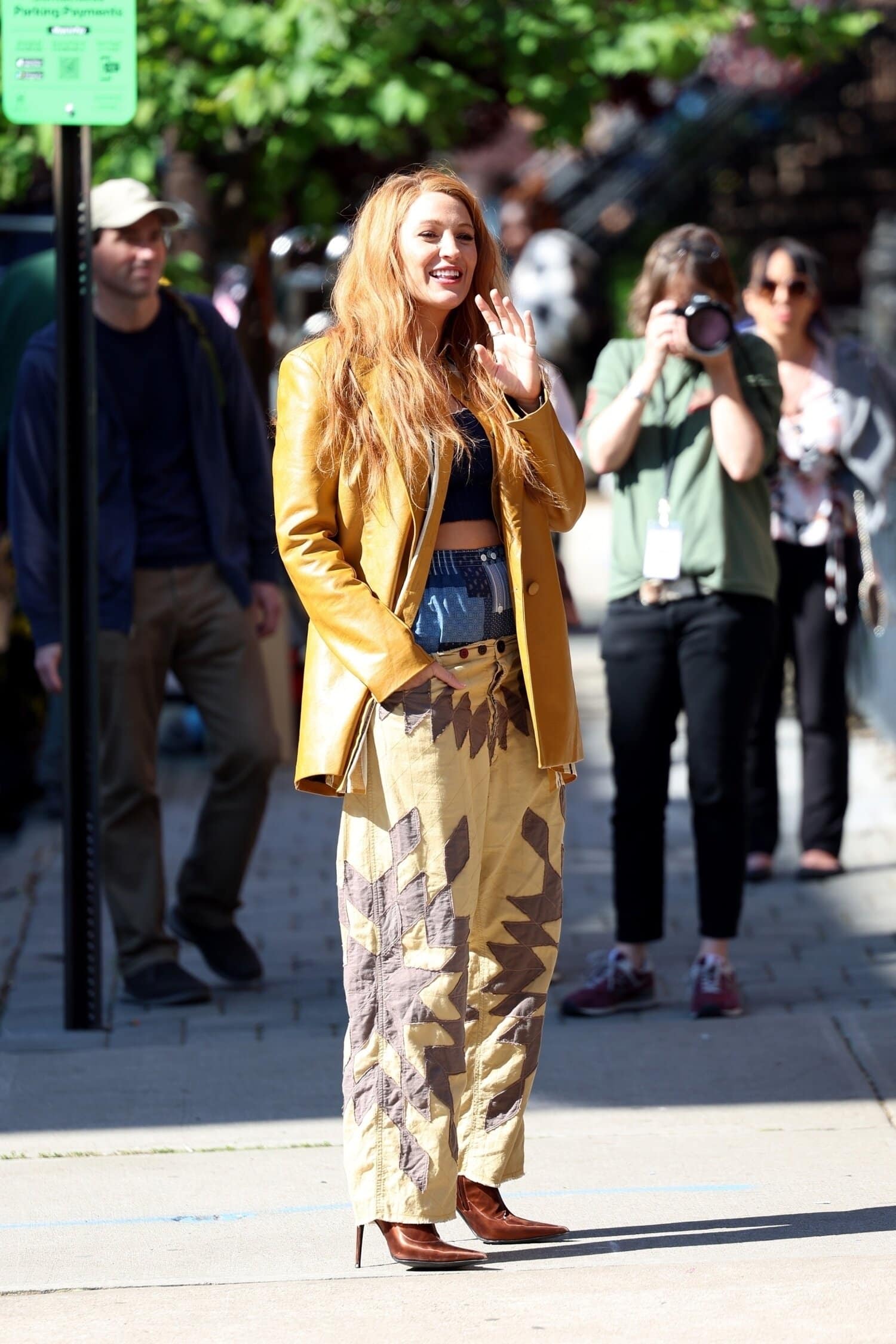 Viime viikolla Lively nähtiin New Jerseyssä kuvaamassa kohtausta sinapinkeltainen nahkatakki yllään. Sen alle oli puettu samaa värimaailmaa oleva kauluspaita. Huomio asussa kiinnittyi kuitenkin housuihin – tai oikeastaan kaksiin sellaisiin. Toki sitä, oliko kyseessä sittenkin tilkkukuvioiset kalsarit eikä toiset housut, emme todennäköisesti saa koskaan tietää.