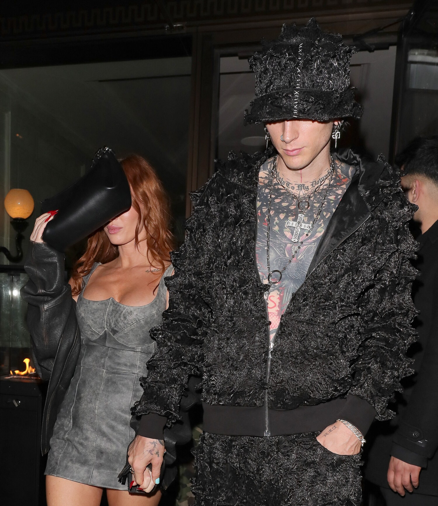 Fox vältteli paparazzien kameroita ja piti laukkua naamansa edessä. Machine Gun Kelly peitteli silmiään mustalla hatulla.