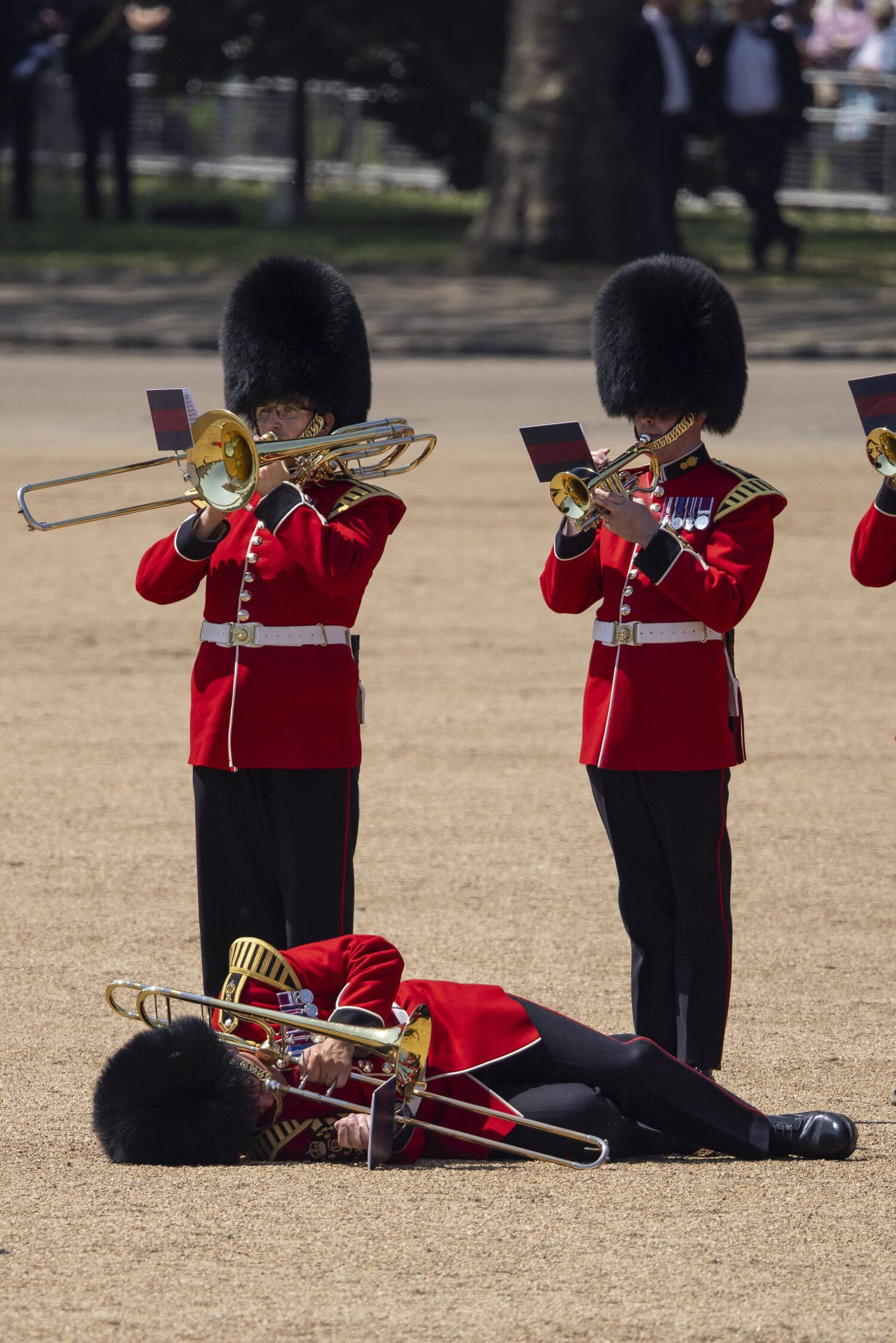 Viime lauantaina järjestettiin paraatin harjoitukset. BBC uutisoi brittisotilaan pyörtyneen harjoituksissa kesken pasuunan soiton. Lontoossa oli silloin erittäin lämmin.