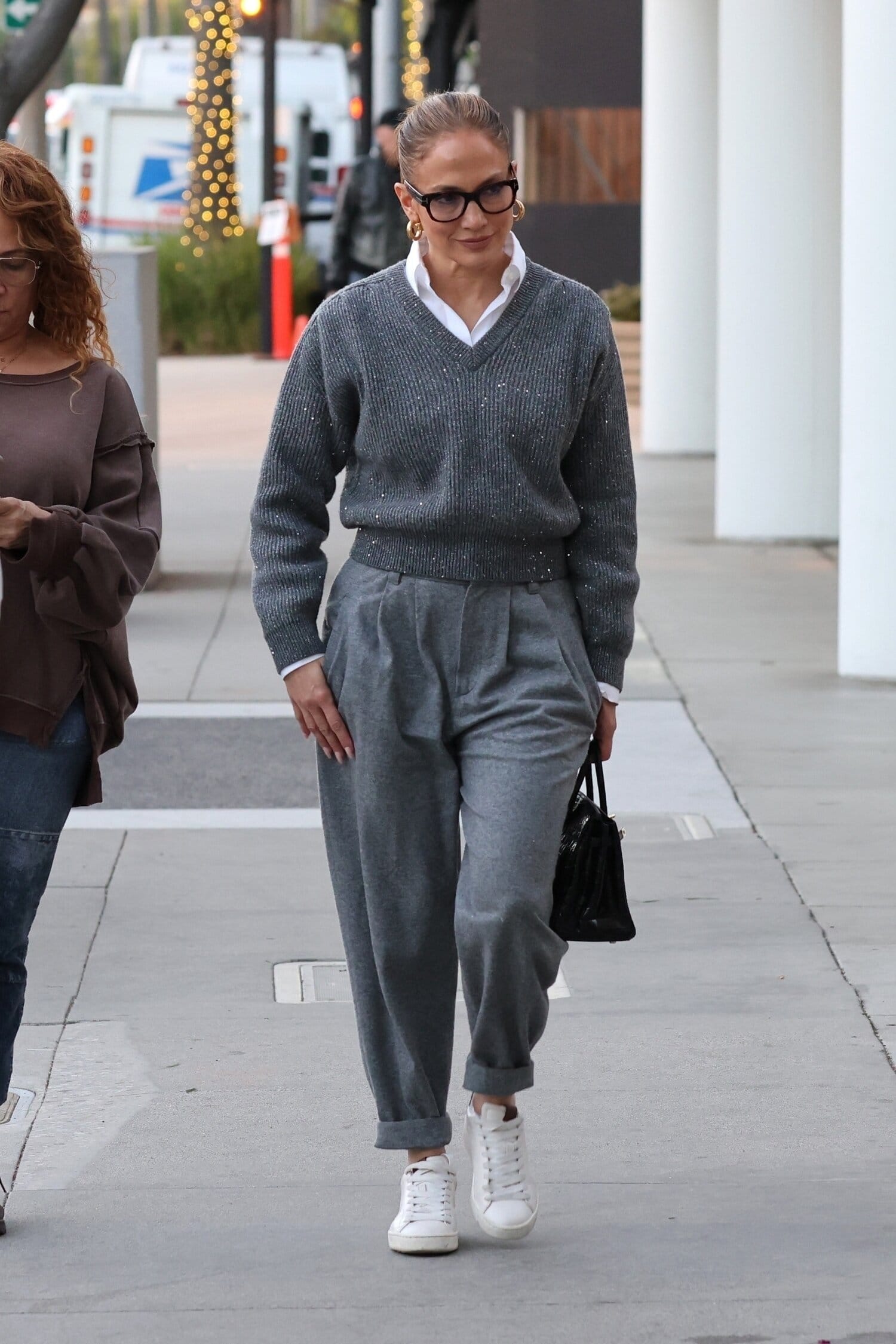 Lopez nähtiin kaupungissa asussa, joka henkii arkista tyylikkyyttä. Se koostui harmaista rennoista housuista, harmaasta neuleesta sekä neuleen alle sujautetusta kauluspaidasta. Tyylikkään kokonaisuuden kruunasivat kultaiset korvarenkaat, näyttävät silmälasit sekä musta suuri laukku.