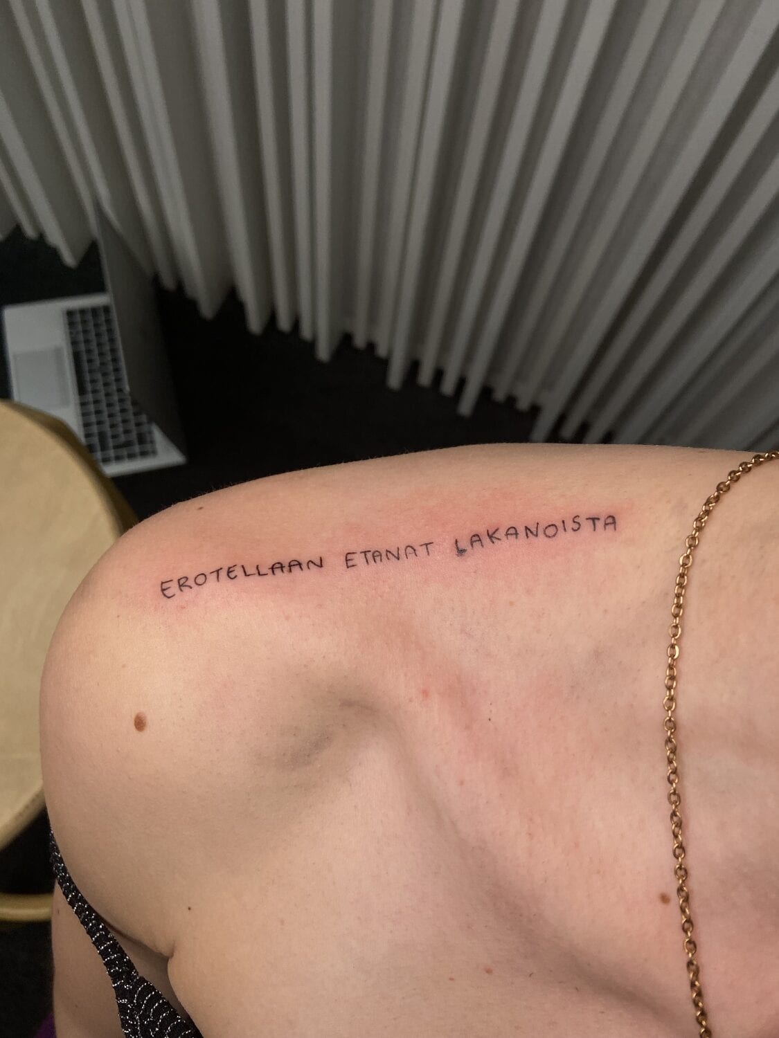 Kuuntelija Jansku Lohjalta halusi ikuistaa lausahduksen olkapäähänsä. Saarinen toimi tatuoinnin suunnittelijana ja kirjoitti tekstin itse kynällä ihoon.