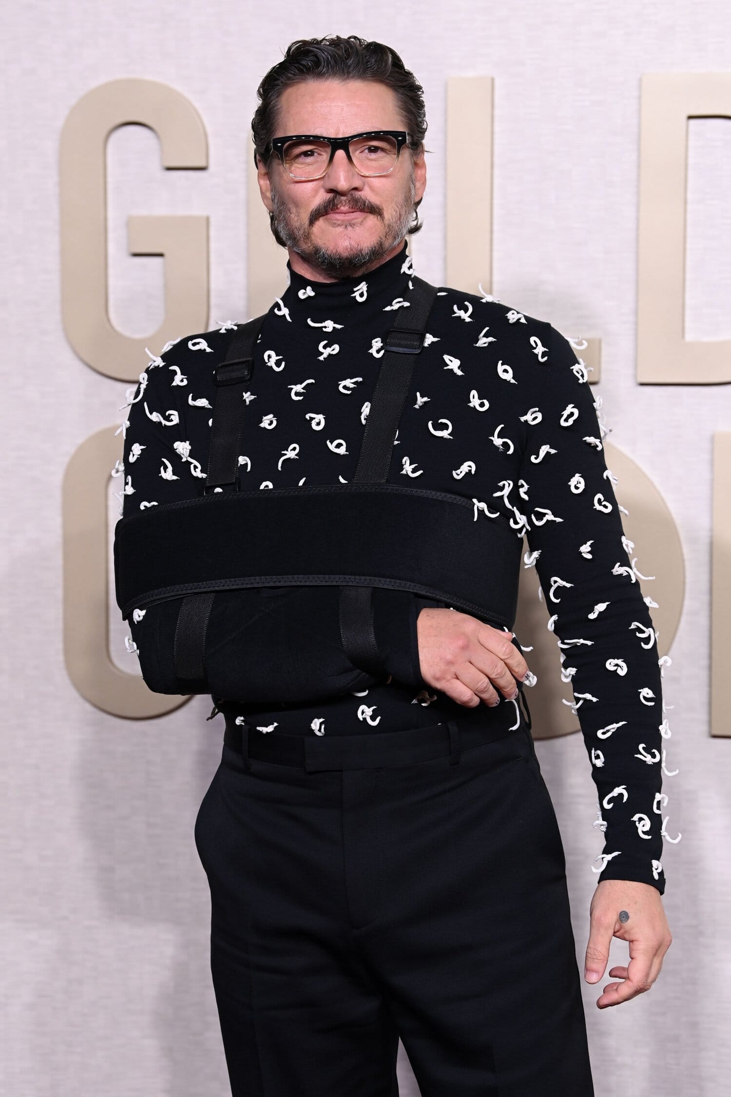 Näyttelijä Pedro Pascal, 48, saapui Golden Globe -gaalaan kokonaisuudessa, joka hurmasi ja sai somekansan myös naurahtamaan. Pascalin asu koostui mustista suorista housuista sekä mustasta valkoisilla kuvioilla koristellusta paidasta.