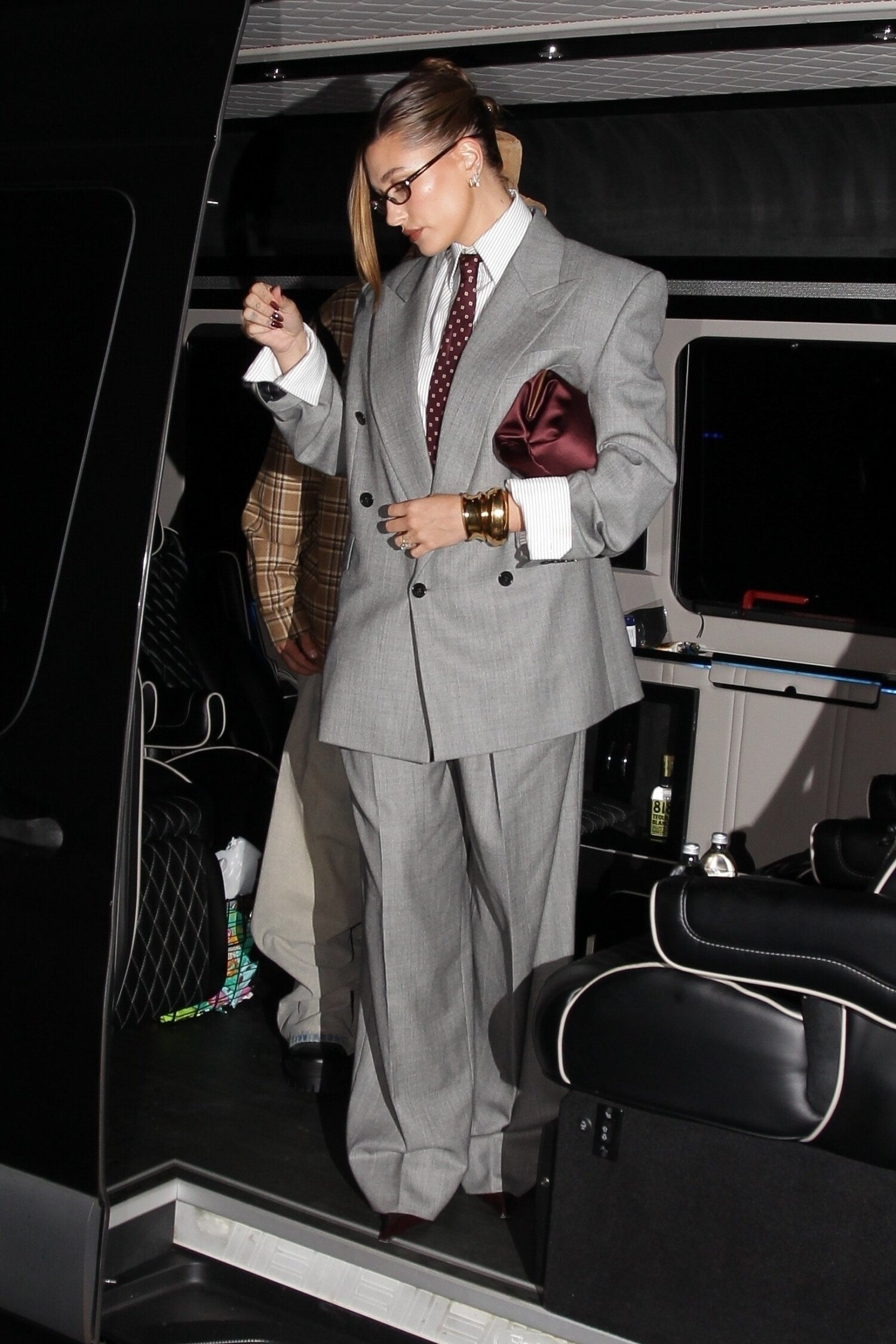 Bieber oli pukeutunut kauden trendiväriin eli harmaaseen rentoon pukuun. Kokonaisuuden täydensivät pukutyyliin sopivasti valkoinen kauluspaita sekä viininpunainen kravatti, syksyn kuumin väri sekin. Sama sävy toistui myös käsilaukussa.