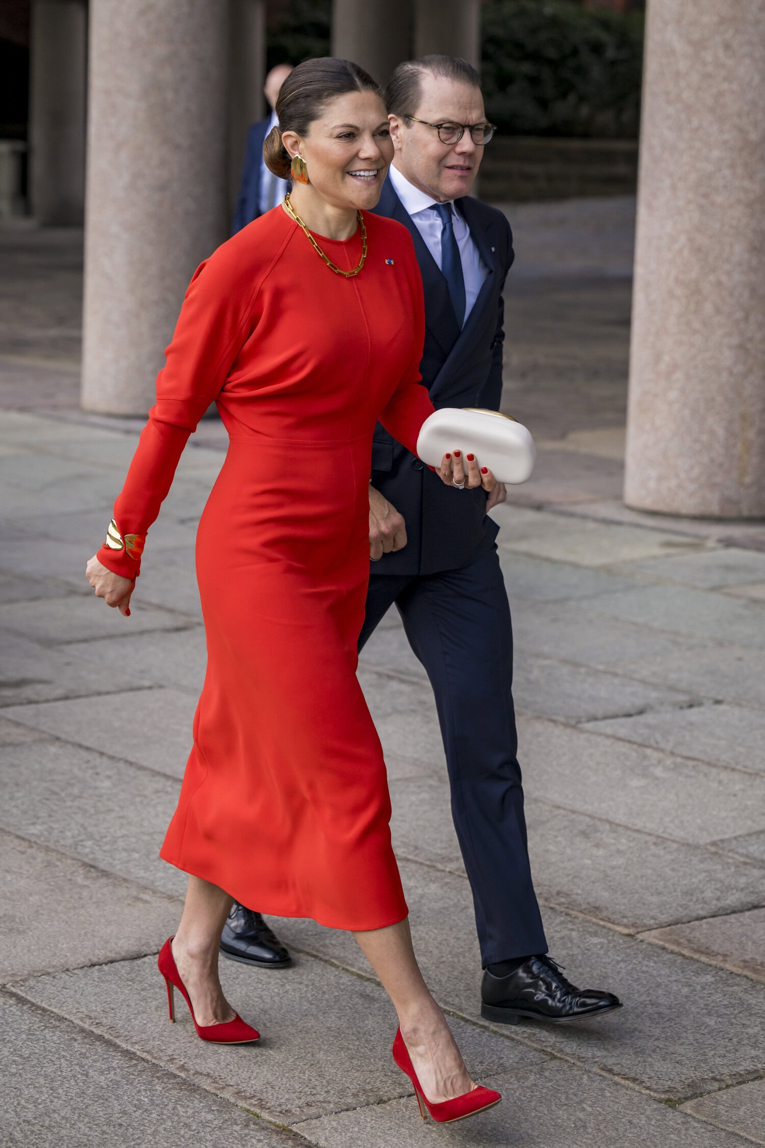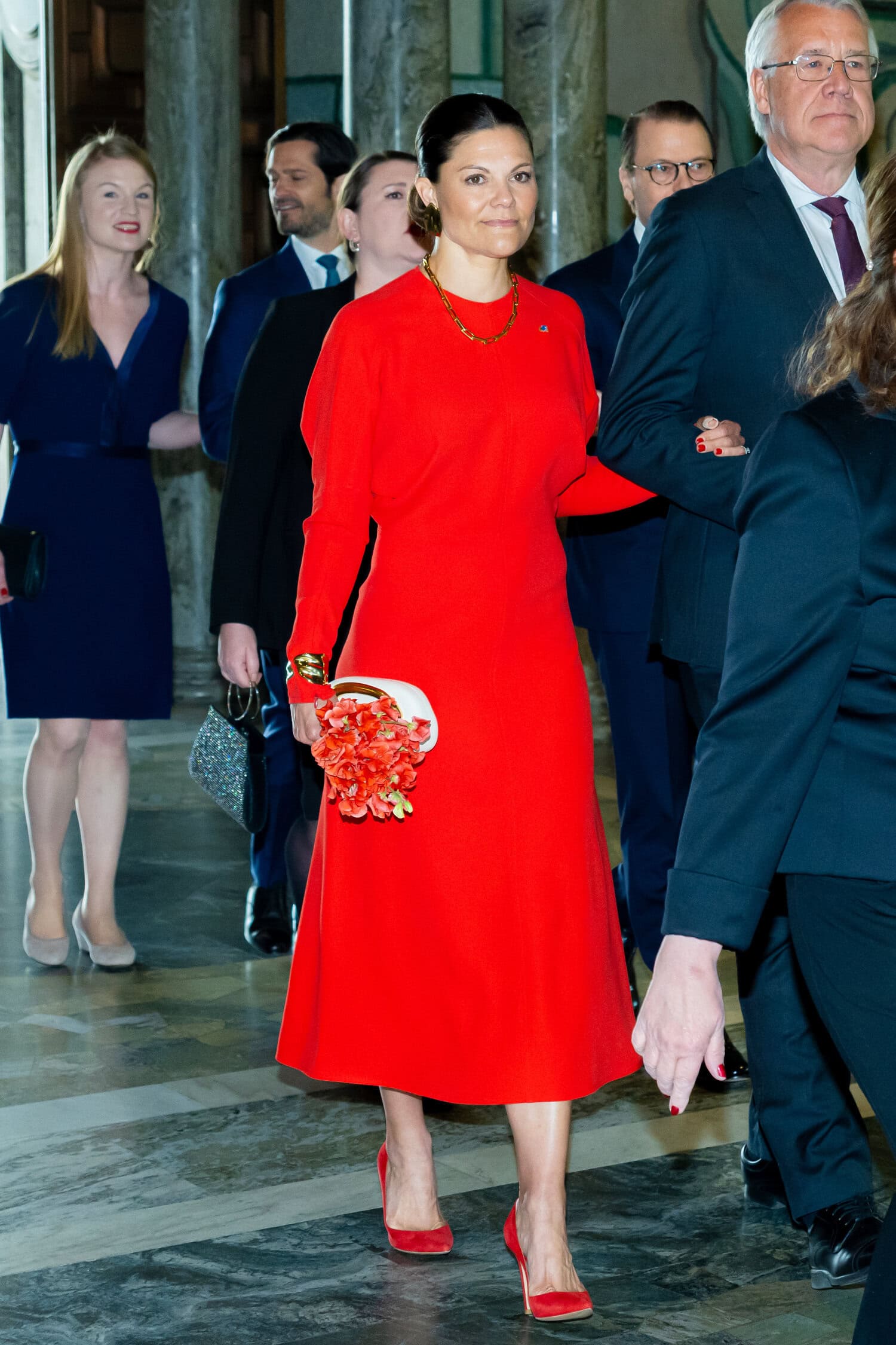 Victoria saapui paikalle punaisessa pitkähihaisessa mekossa, joka oli kuin tehty hänelle. Samaa punaista väriä nähtiin myös korkokengissä. Kokonaisuutta rikkomaan hän oli valinnut valkoisen pikkulaukun.