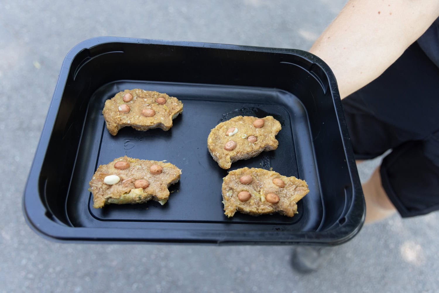 Ensimmäisenä helleherkkuja pääsivät maistamaan huulipekarit. Possun muotoisella muotilla tehdyissä annospaloissa oli omenan lisäksi maapähkinää. Eläintarhan mukaan pekarit etsivät hetken aikaa oksien päälle sijoitettuja herkkuja, mutta pian jäädykkeet katosivat nopeasti parempiin suihin.