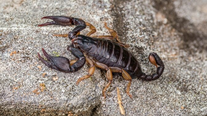 Laji on tunnistettu keltapyrstöskorpioniksi. Keltapyrstöskorpioni on lievästi myrkyllinen, mutta sitä ei pidetä erityisen vaarallisena ihmiselle. Pistoksesta voi seurata paikallista turvotusta ja kipua. Lajia esiintyy Etelä-Euroopassa ja Luoteis-Afrikassa, mutta sitä on myös tavattu Isossa-Britanniassa.