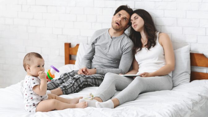 Hän kertoo yrittävänsä nukahtaa, mutta kuulevansa lapsensa itkevän ja miehensä yrittävän rauhoitella lasta.