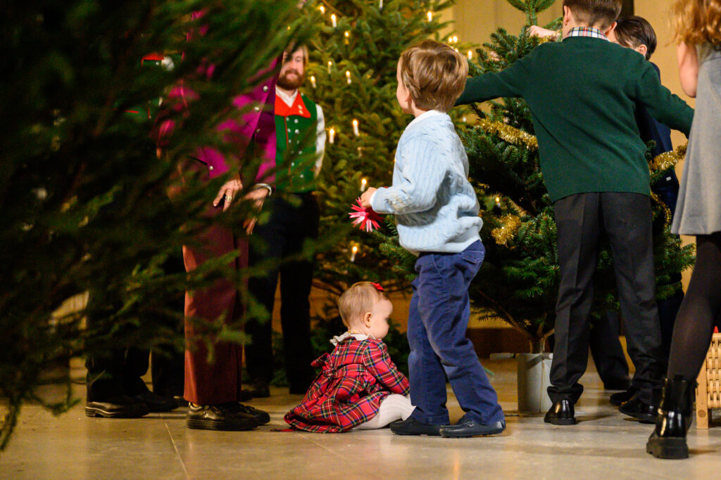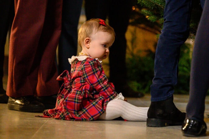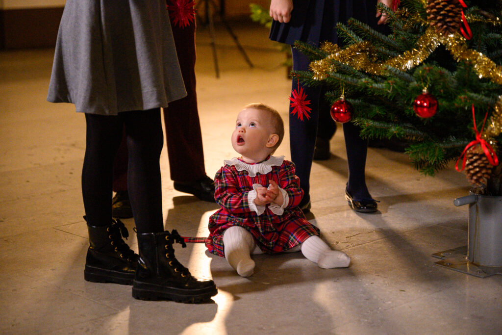 Nuori Västerbottenin herttuatar edusti kuusenkoristelutilaisuudessa punaruudullisessa mekossa ja punainen rusetti hiuksissaan.